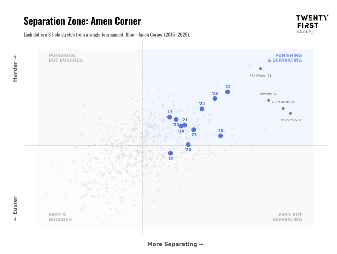 We’ve analysed every comparable three-hole stretch across PGA Tour, DPWT, and LIV Golf events since 2015. The data is definitive: Amen corner has ranked in the top 15% for field separation every year for the past 11 Masters, and in the top 10% on 7 of those occasions. Other stretches occasionally spike higher, but none sustain it.