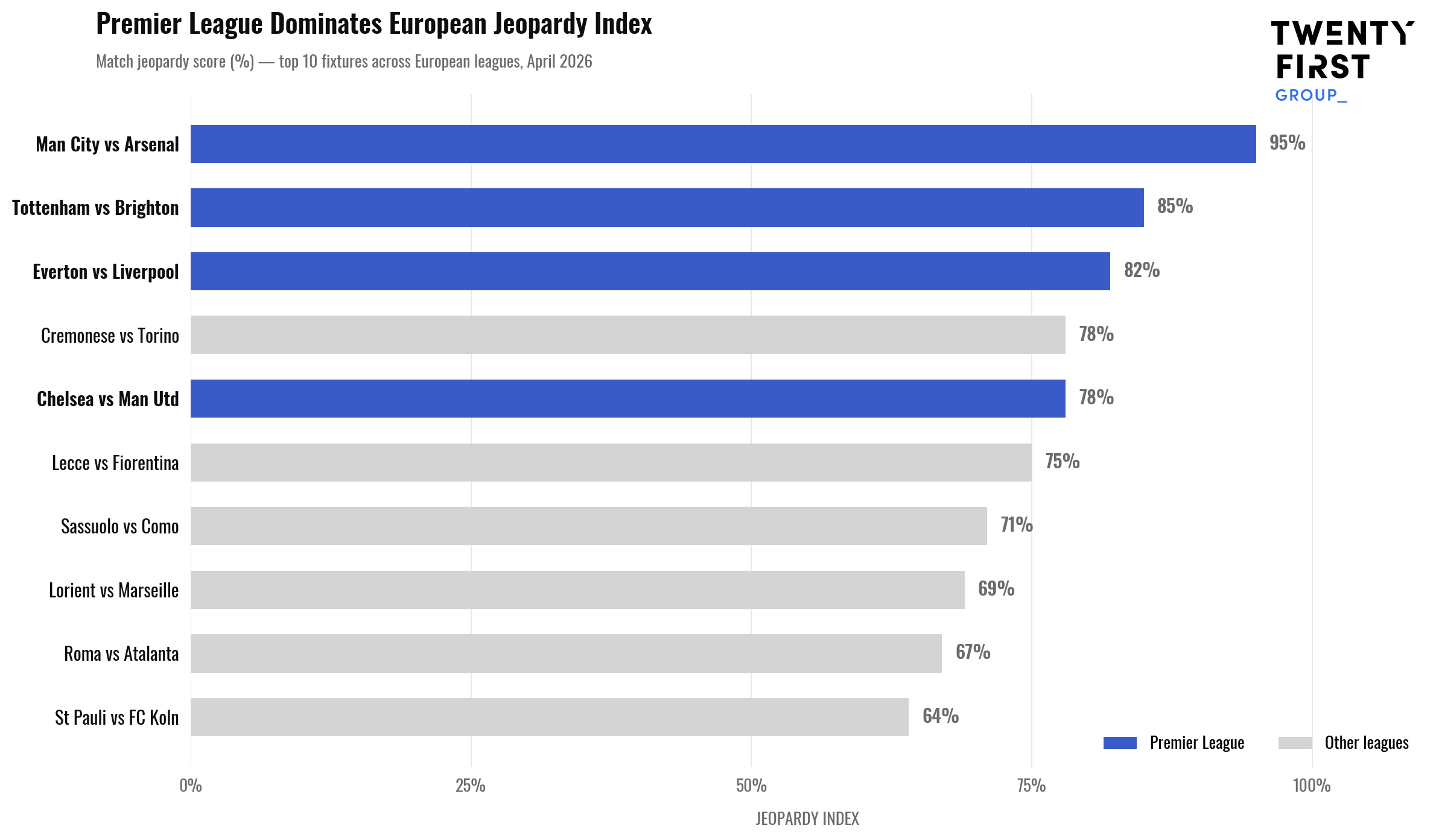 Our Jeopardy Index, which ranks this weekend’s matches in Europe’s biggest leagues by their stakes and uncertainty, places Premier League games in four of the top five spots. Both factors are heightened by the fact that the teams in these games (namely City, Arsenal, Tottenham Hotspur, Everton and Liverpool) are competing for positions that they were not favourites for pre-season.